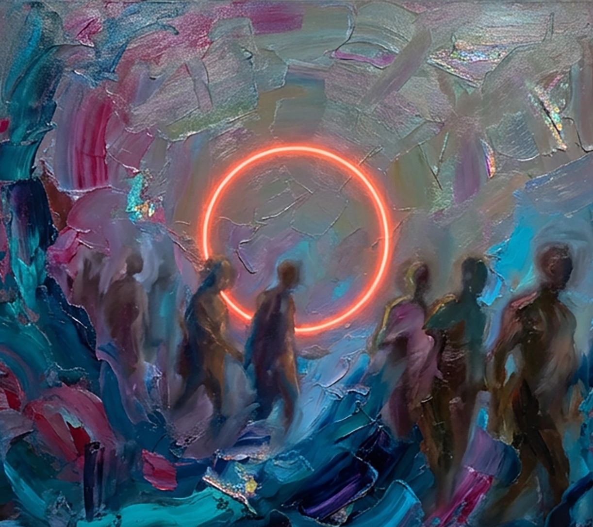 The Gravity of the Collective portrays human presence dissolving into a shared field shaped by silent attraction. Figures exist as thresholds between autonomy and convergence, movement and stillness. A luminous core draws without commanding, binding the collective through felt alignment rather than definition. The work reflects a contemporary world guided by unspoken pull rather than certainty.
