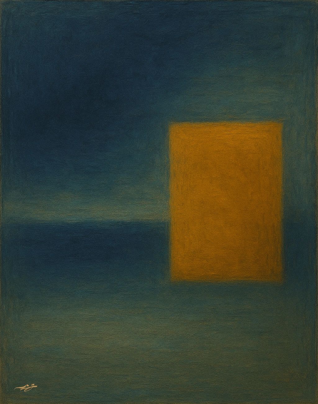 Echoes of Silence transforms seeing into an encounter with stillness and quiet presence. A vast field of layered blue holds a luminous golden form felt more than defined, while an irregular hand-drawn trace introduces fragile human imperfection. Silence here becomes resonance rather than absence. The work suspends the viewer between control and surrender, where meaning slowly reveals itself beneath the surface.
