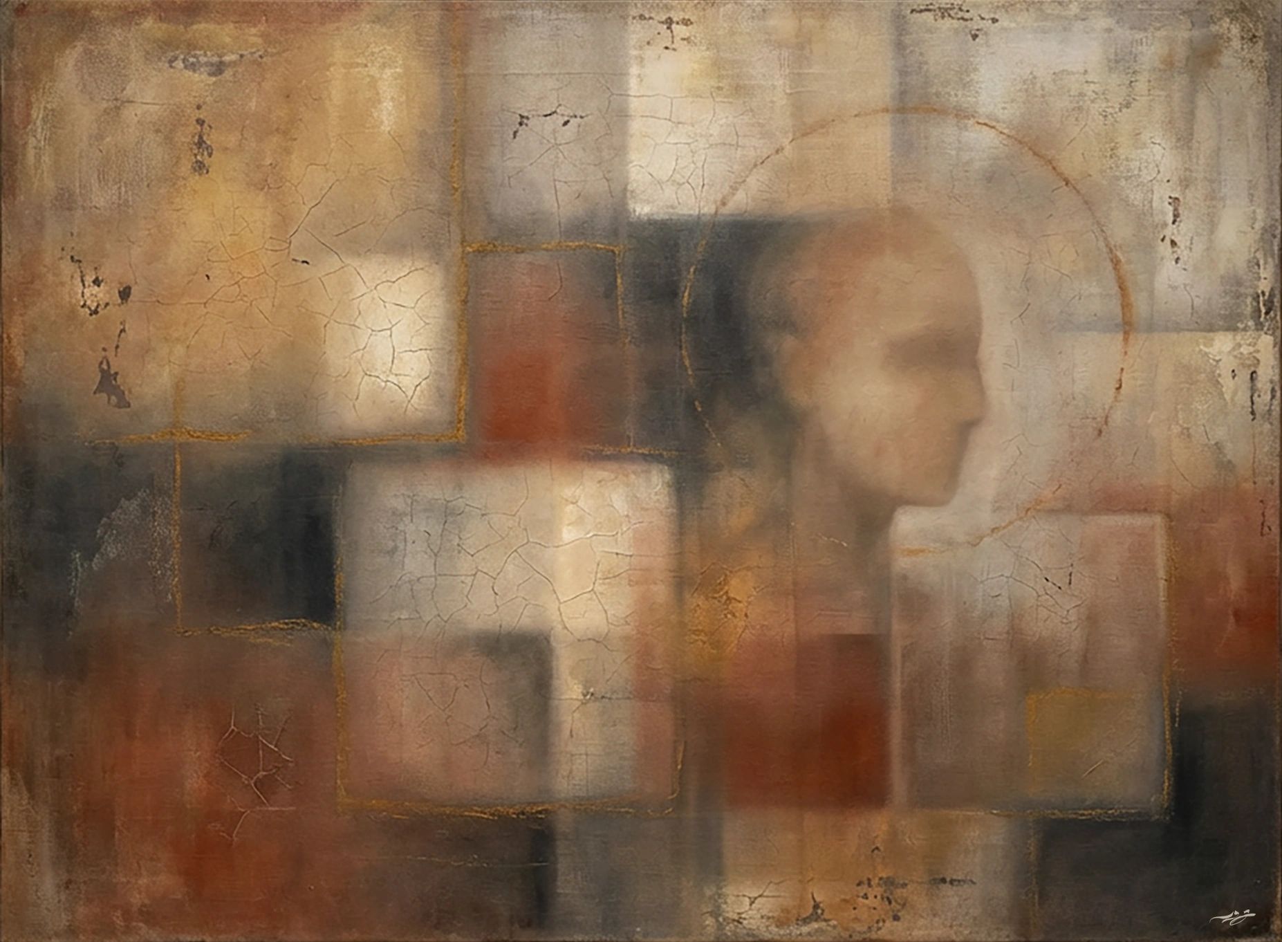 The Timeless Memory reflects what endures when identity fades and form becomes an echo. A softened figure hovers between presence and erasure, surrounded by fractured geometries that suggest lingering layers of thought and time. Muted earth tones, worn textures, and subtle gold traces evoke memory as something unearthed rather than preserved. The work asks what resonance remains when all visible detail has disappeared.