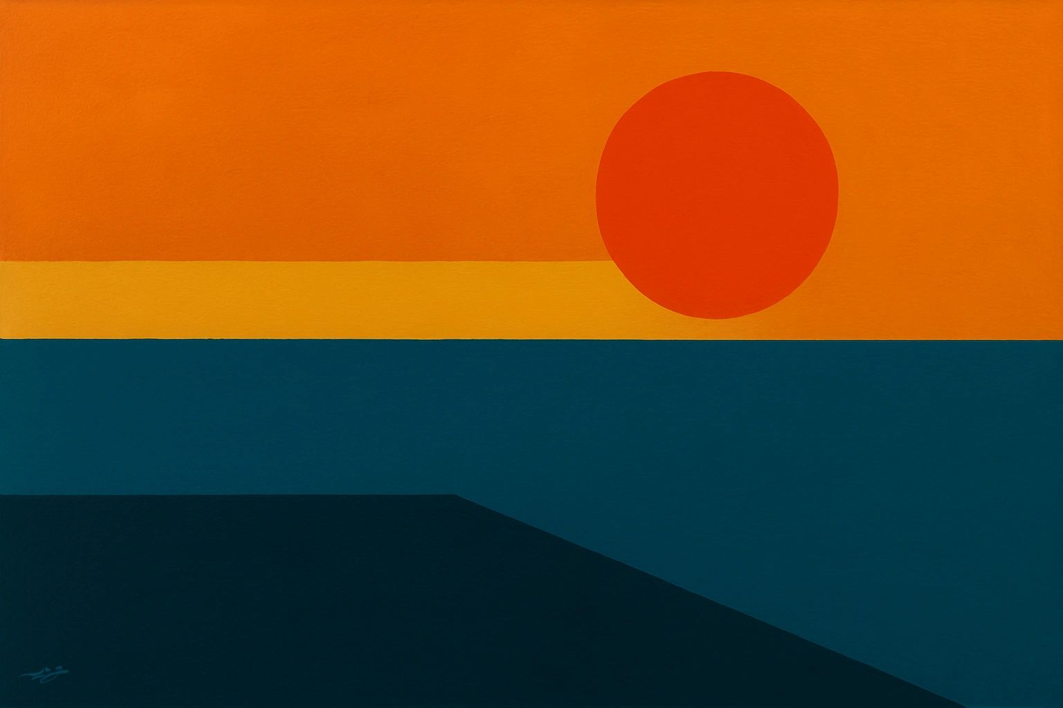 Birth of Horizon captures a suspended moment of emergence, where the horizon becomes a threshold of awareness rather than a landscape. The luminous, offset sun marks the quiet pulse of early consciousness, while layered color fields suggest the gradual formation of depth and meaning. The work invites contemplation of an inner beginning—the instant awareness first recognizes itself.